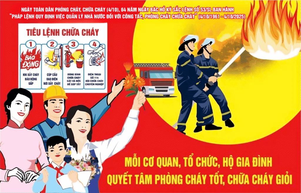 Ngày 04/10 hằng năm được chọn là “Ngày Toàn dân Phòng cháy, Chữa cháy”, nhằm nâng cao nhận thức và trách nhiệm của tổ chức, cá nhân trong việc chủ động phòng ngừa, sẵn sàng ứng phó với các sự cố cháy, nổ – góp phần bảo vệ an toàn tính mạng và tài sản của bản thân, gia đình và cộng đồng.